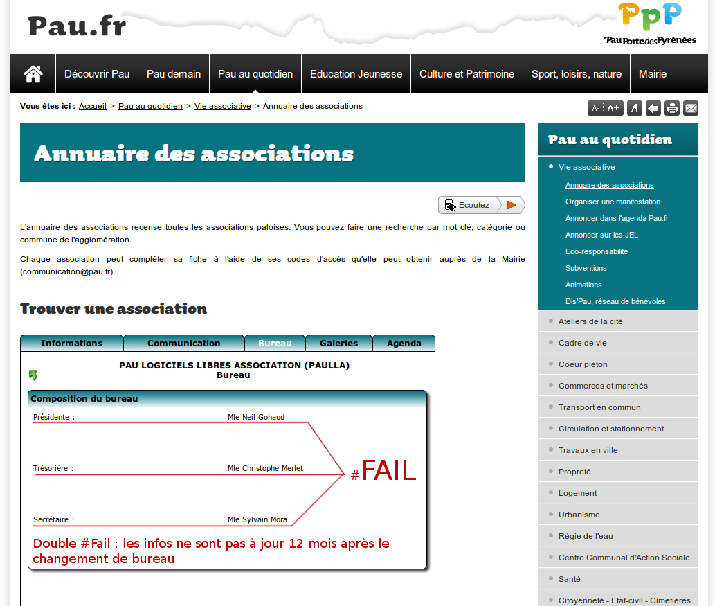 Fail du site de la ville de Pau sur la fiche de l'asso PauLLA
